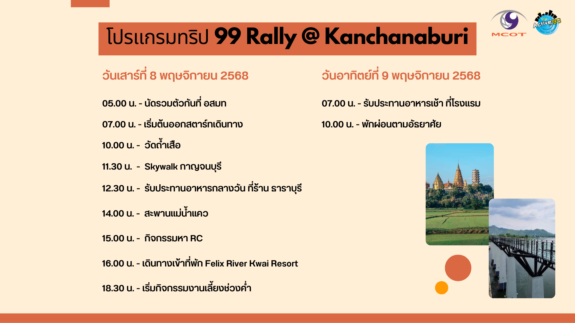 FM 99 ชวนแฟนรายการร่วมเดินทางประจำปี ในกิจกรรม FM 99 Rally Family ลั้ลลา กาญจนบุรี สักการะ พระปางประทานพรองค์ใหญ่ ชมวิวจากเนินเขามองเห็นทิวทัศน์ ที่วัดถ้ำเสือ เดิน Skywalk กระจกใส แบบ 360 องศา แลนด์มาร์กแห่งใหม่ริมแม่น้ำแควทานมื้อเที่ยงแสนอร่อย ฟินๆ กลางแม่น้ำ 2 สี